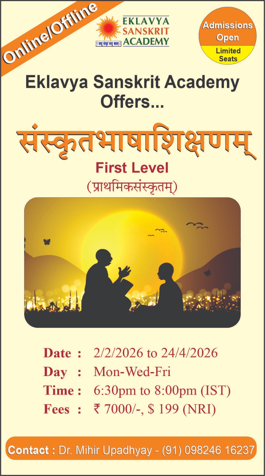 I am a student of Eklavya Sanskrit Academy since one year. I am thoroughly enjoying the way Dr Mihir teaches, with great passion and makes it easy to understand and grasp. I have also seen a 4 year old student who is also thoroughly enjoying learning Sanskrut. Hats off to Eklavya group and Mihirsir for encouraging people to learn Sankrut in the right way... Radhika Modi
